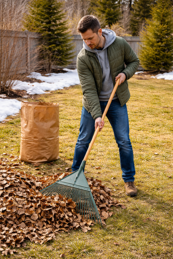 Start by letting things dry out a bit. Even a few days of milder weather can firm up the surface so you’re not compacting the soil every time you step onto the lawn. Once it no longer feels squishy, you can move to gentle cleanup.
